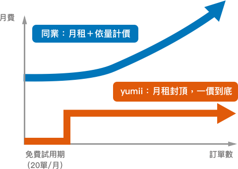 1. 一價封頂:Yumii 以固定月租費計價,網路預約的訂單再多,也不會增加您的費用支出。